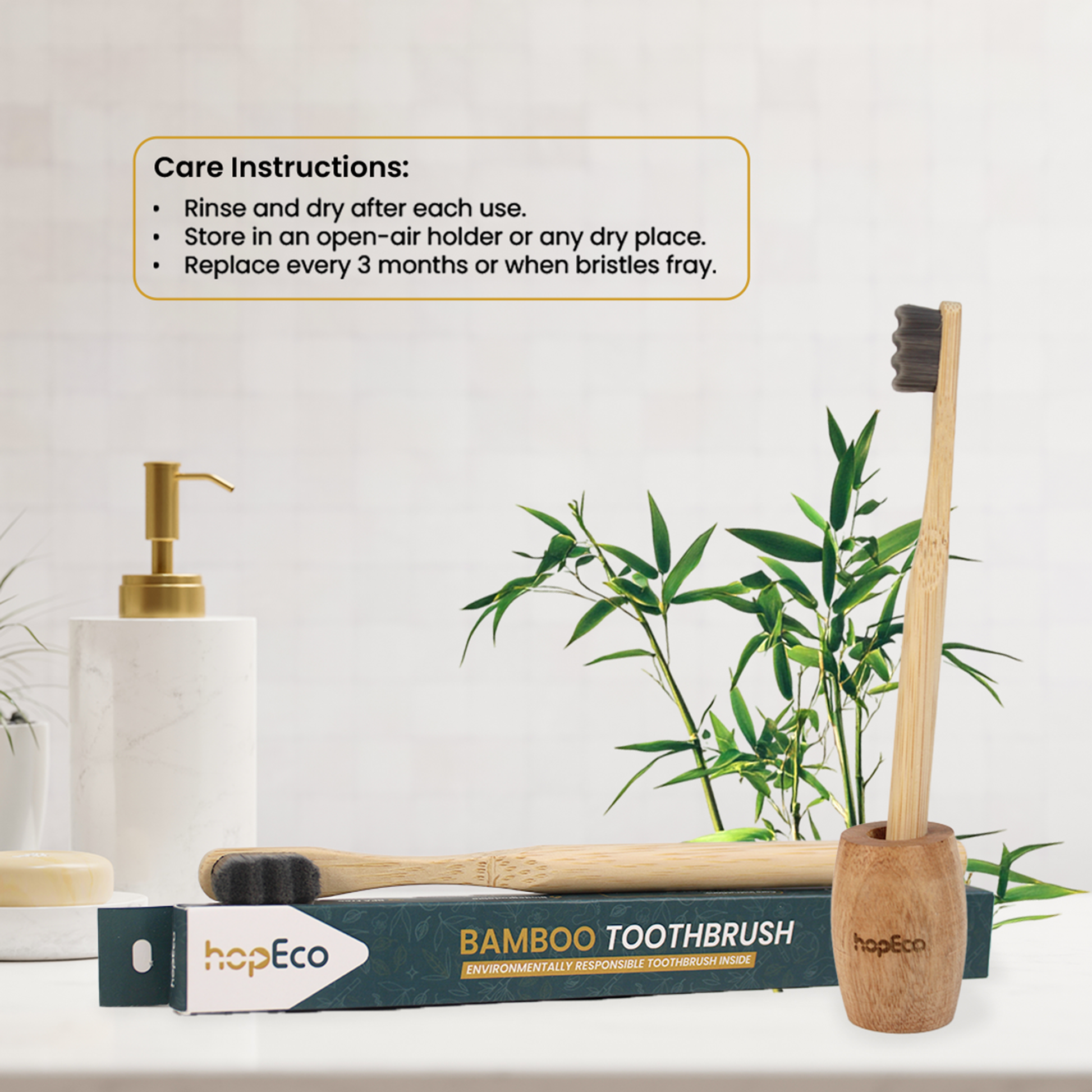 Unlike conventional plastic toothbrushes that end up in landfills and oceans for centuries, hopEco Bamboo Toothbrushes naturally decompose, ensuring minimal environmental impact. Featuring BPA-free soft bristles, they offer gentle yet effective plaque removal, ideal for sensitive gums and teeth.